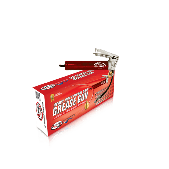 Hi-Tec Pistol Grip Grease Gun, with a cast aluminium pump head for durability and long life. Develops grease pressure up to 8,000PSI. Bleeder valve for purging air pockets. C/W flexible outlet.